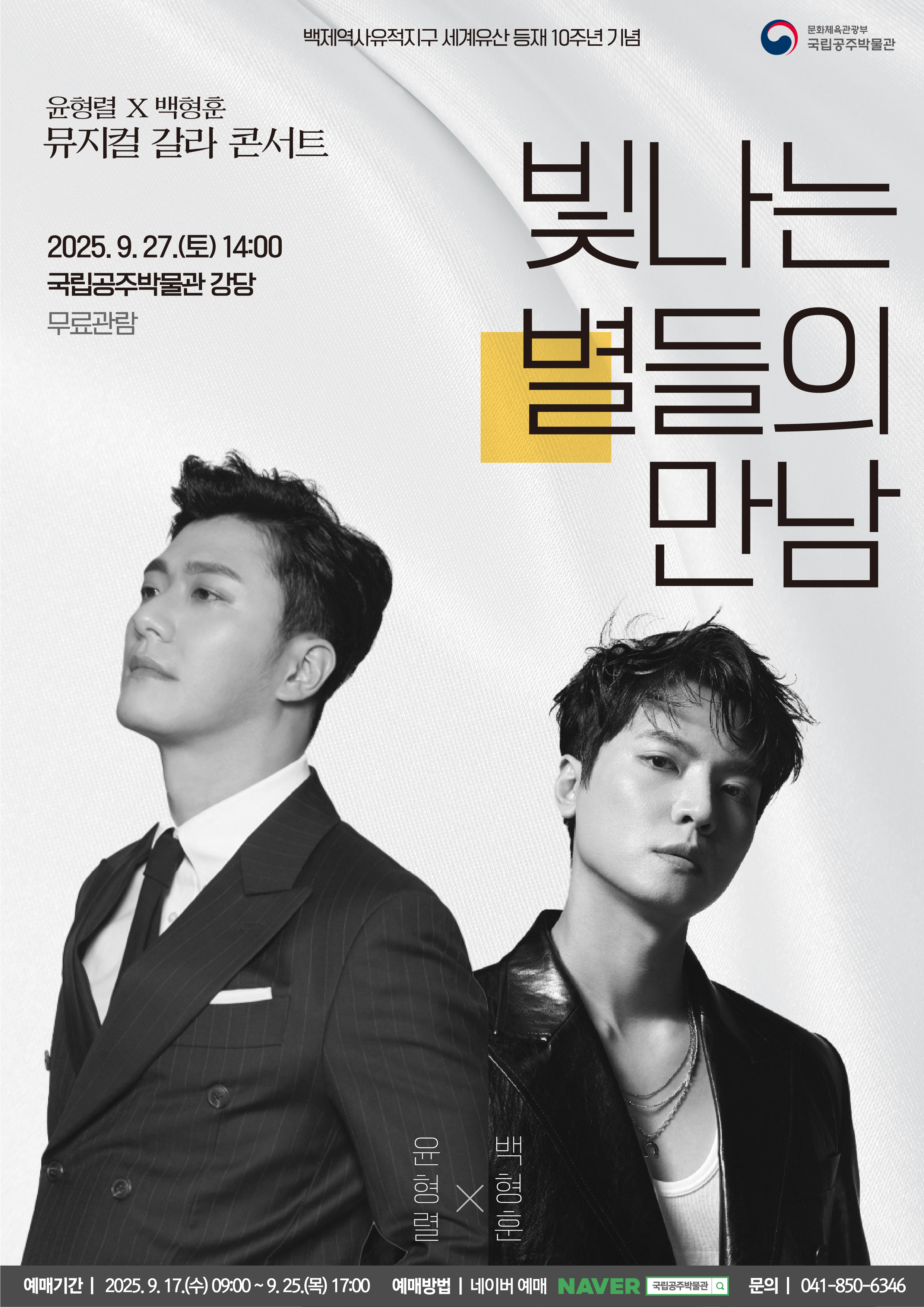 국립공주박물관(관장 최장열, 이하 박물관이라 한다)은 백제역사유적지구 세계유산 등재 10주년을 기념하여 오는 9월 27일(토) 14시 박물관 강당에서 <윤형렬x백형훈 뮤지컬 갈라 콘서트>를 개최한다.